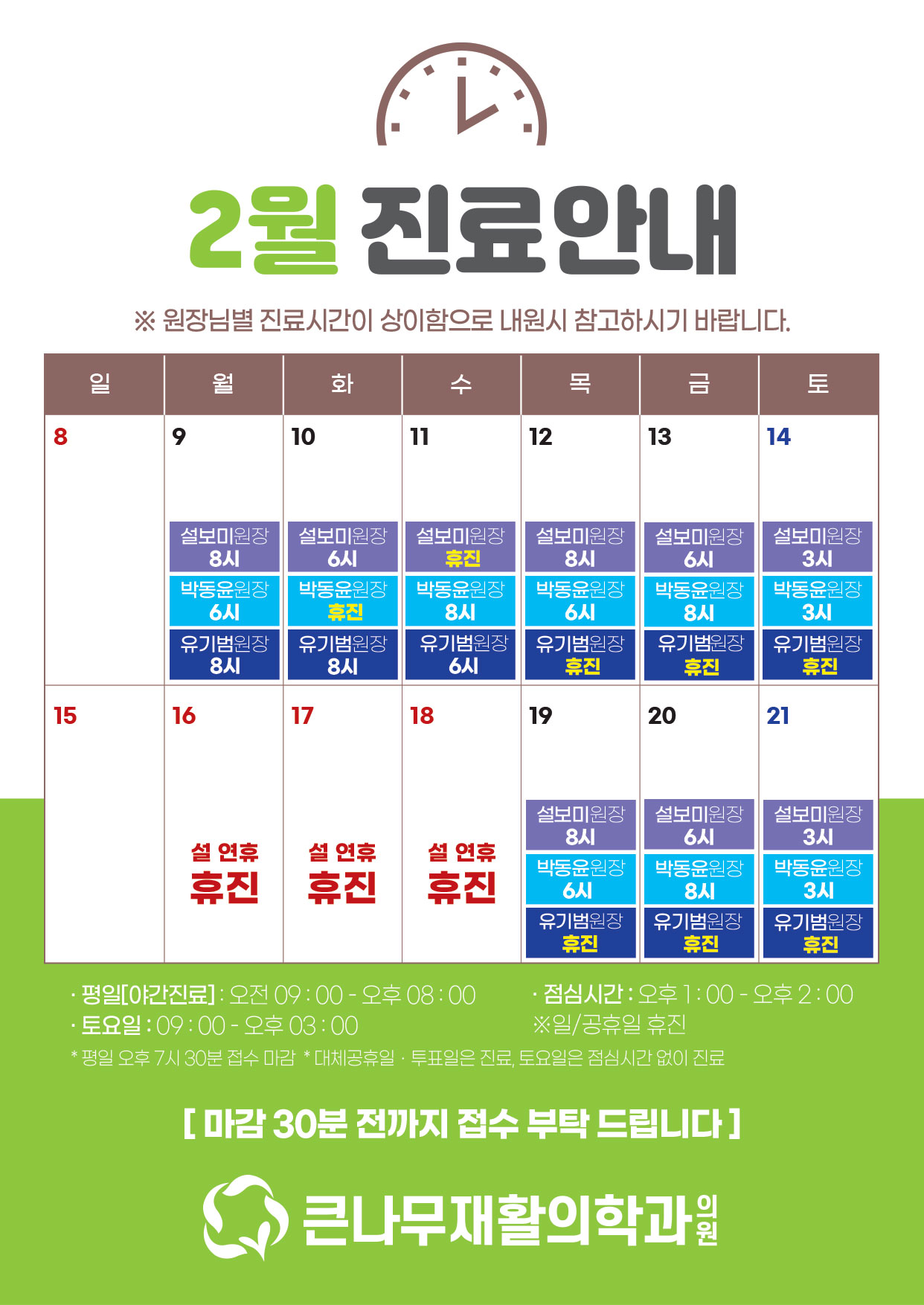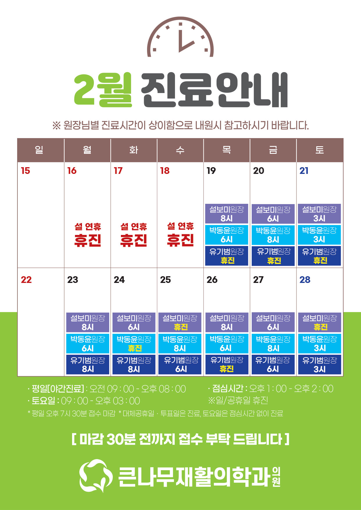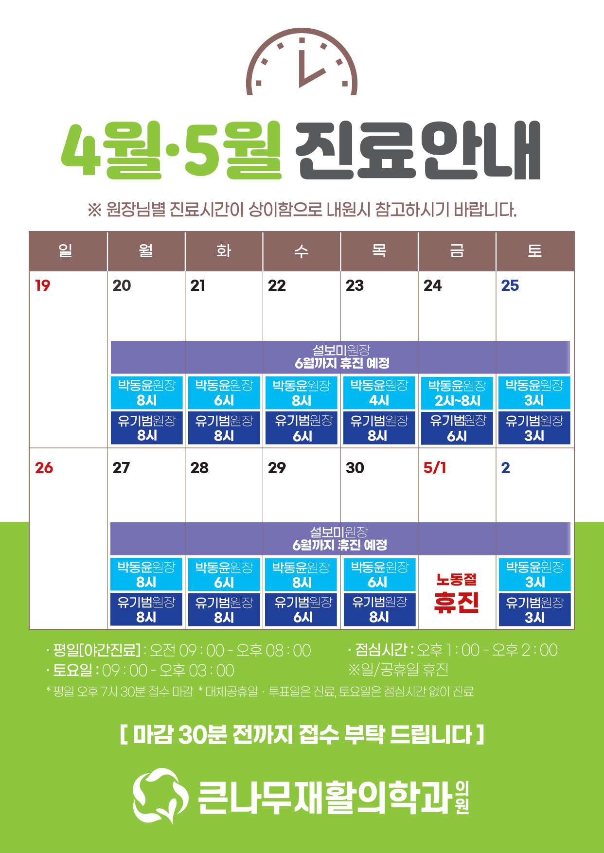 큰나무재활의학과는 바쁜 직장인과 학생들의 진료 및 편의를 위해 평일 야간진료를 시행하고 있습니다.