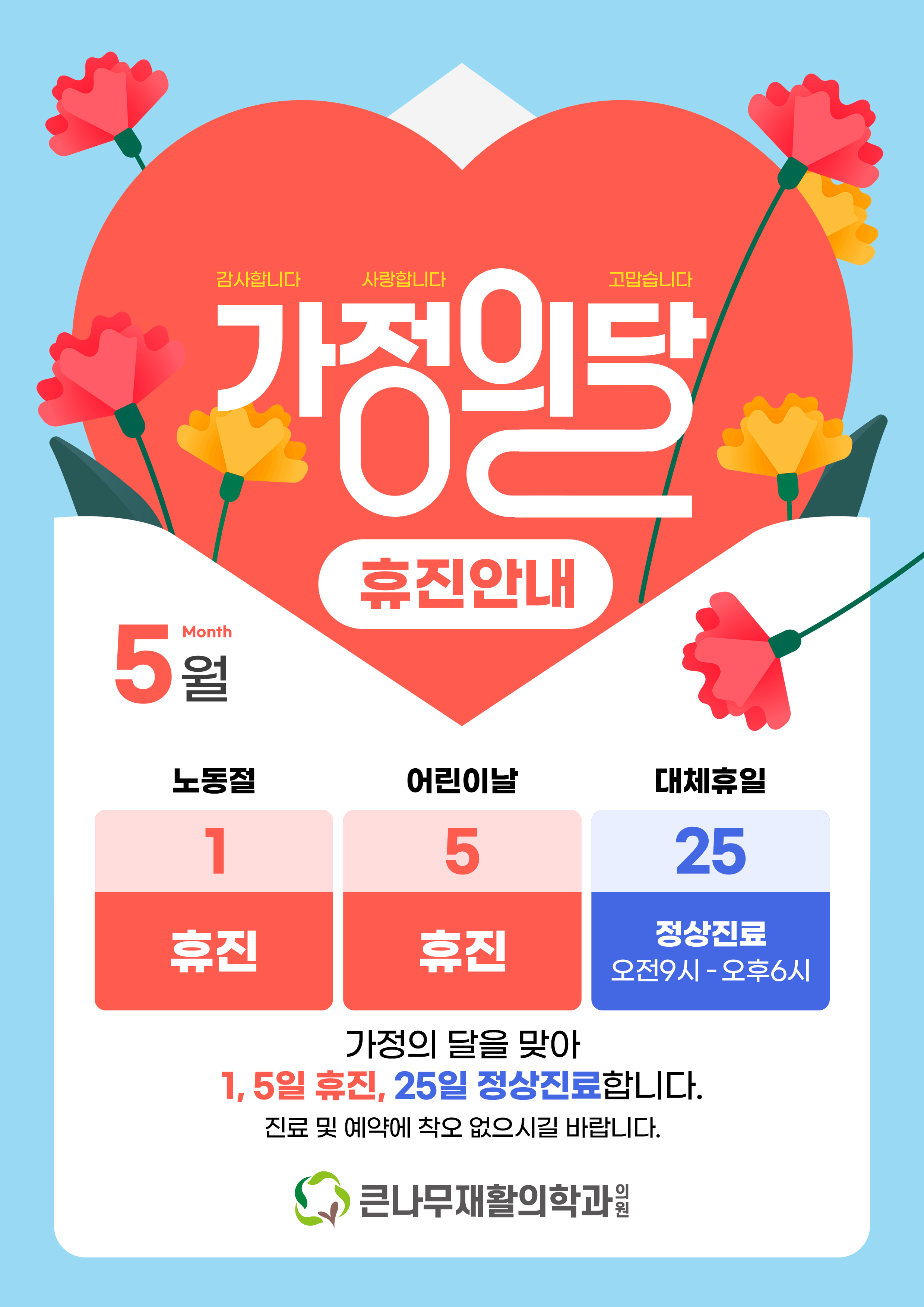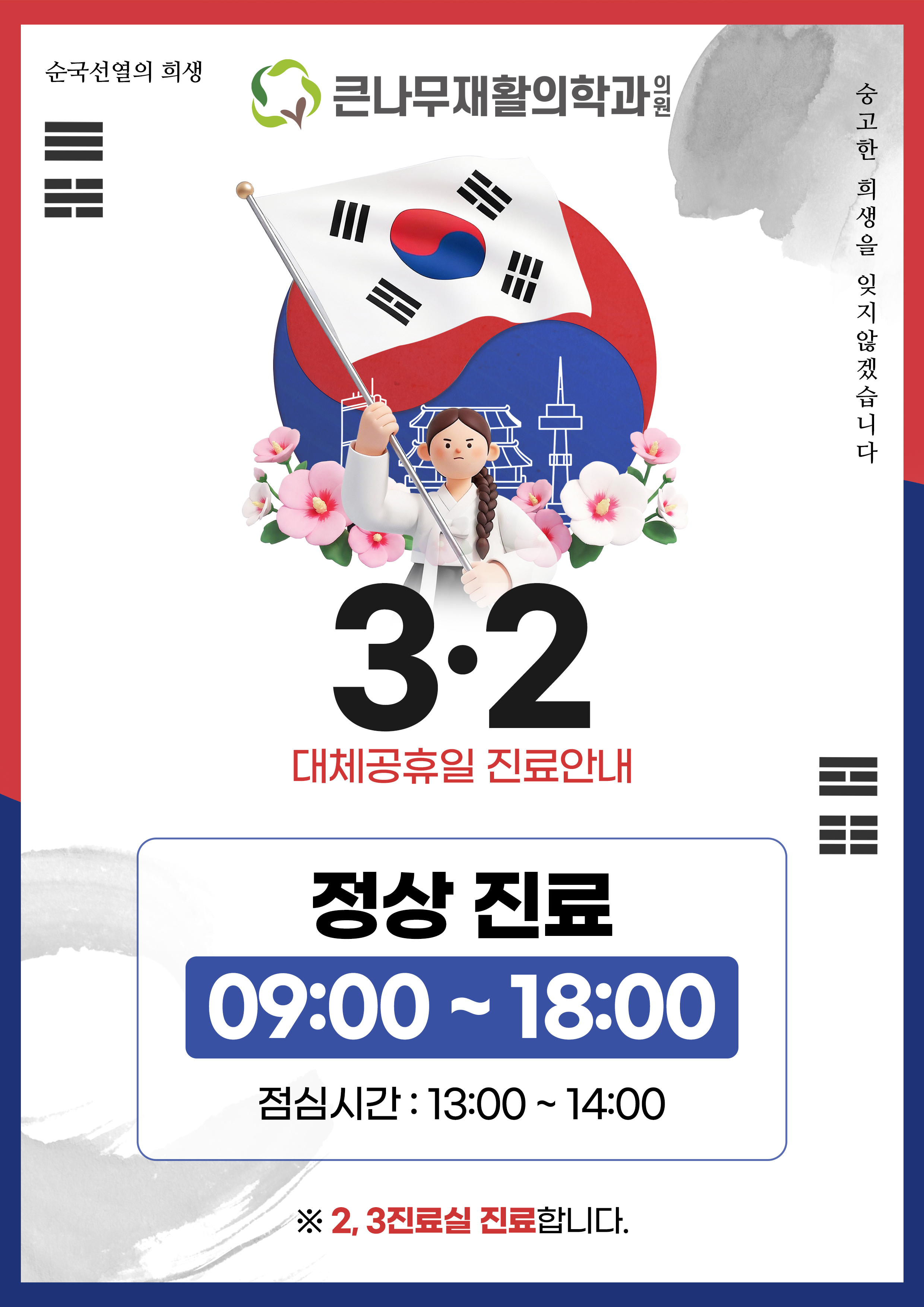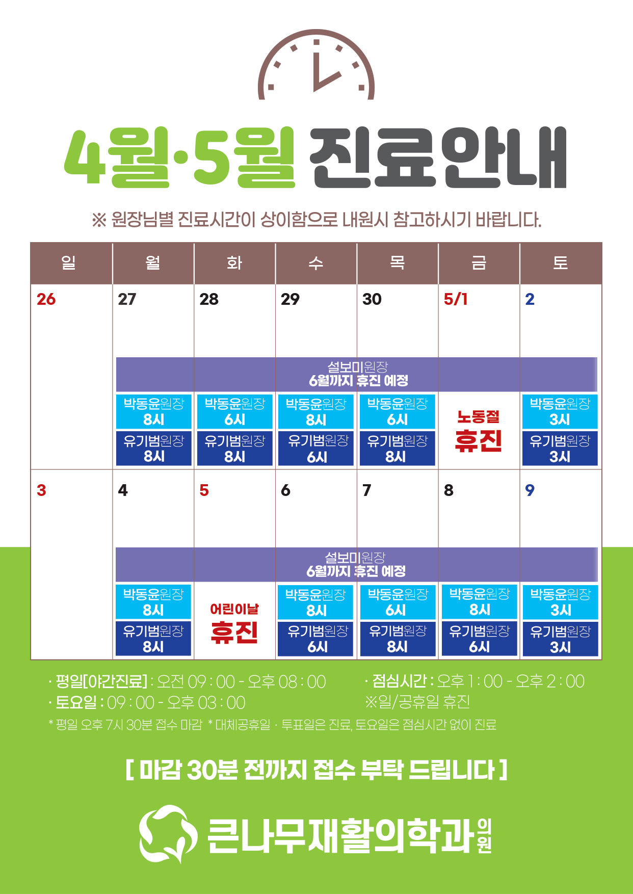 큰나무재활의학과는 바쁜 직장인과 학생들의 진료 및 편의를 위해 평일 야간진료를 시행하고 있습니다.