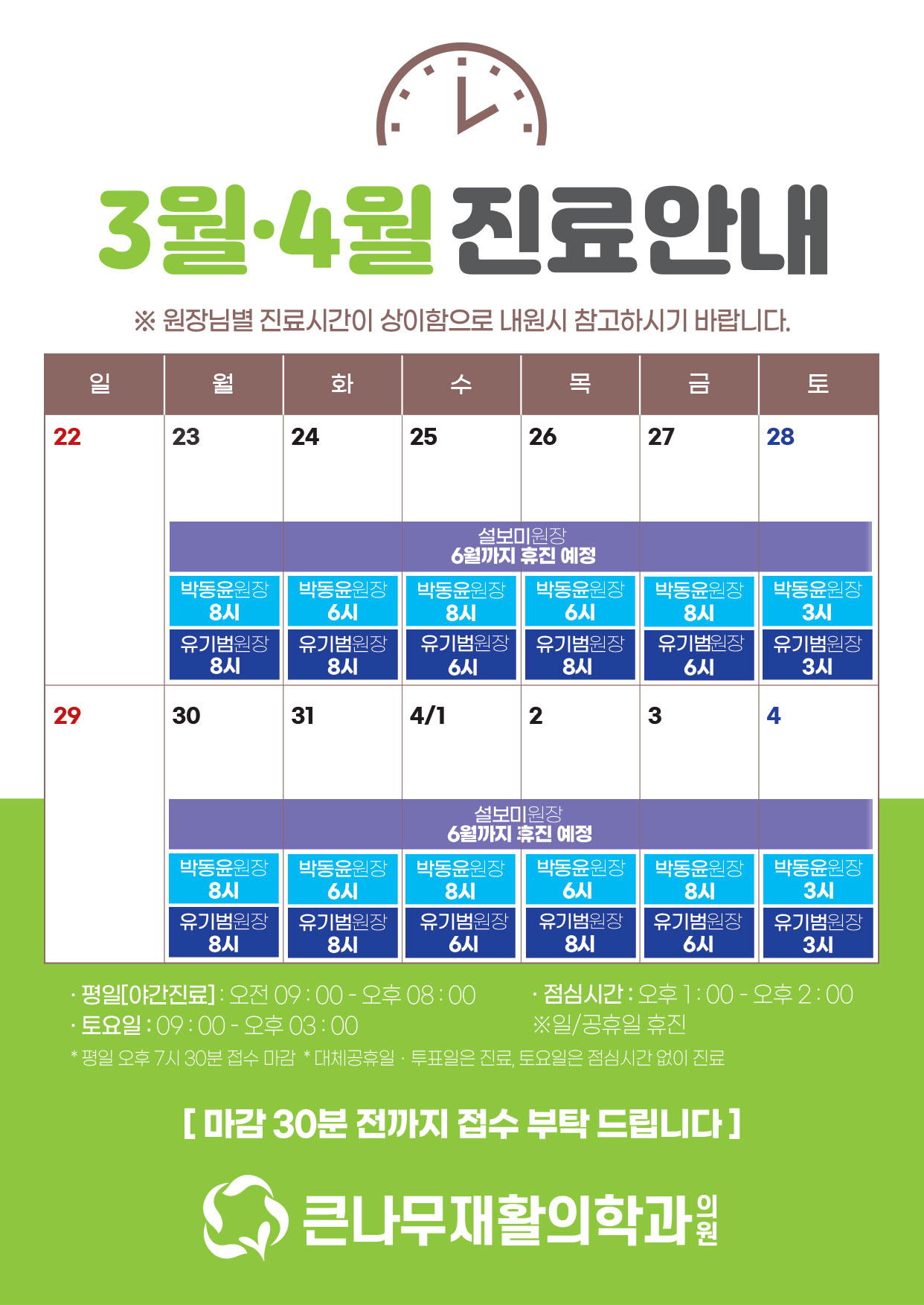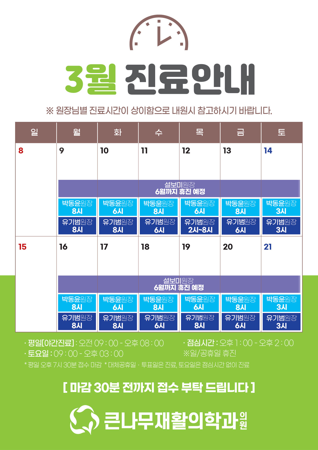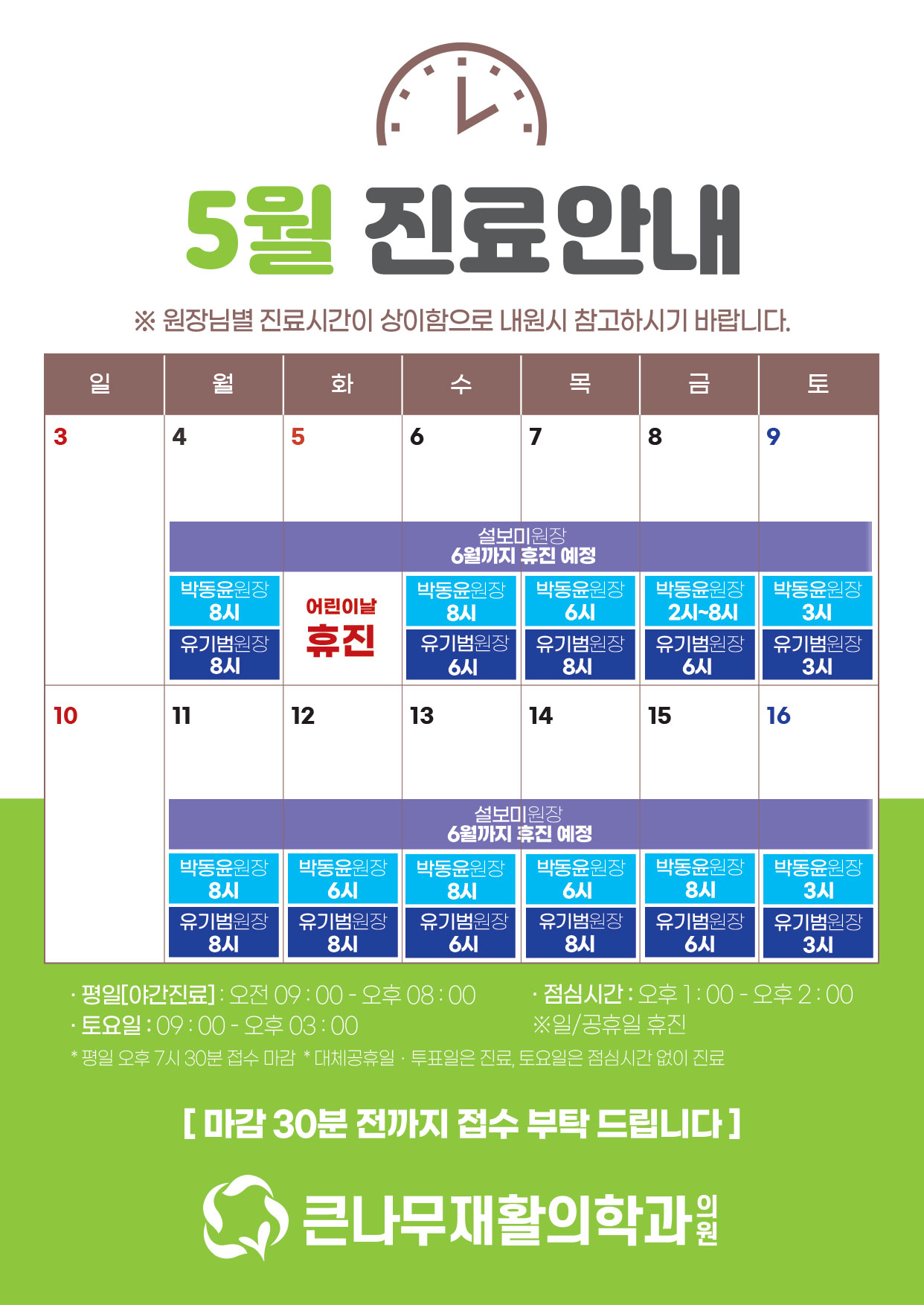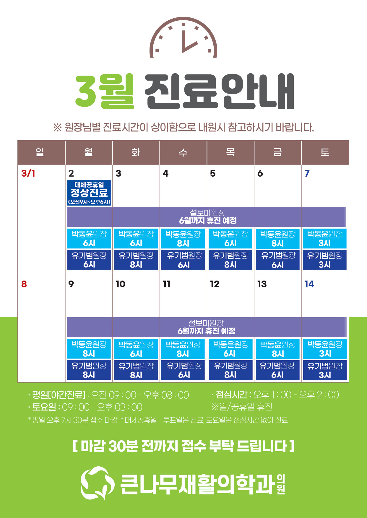 * 평일 오후 7시 30분 접수 마감 * 대체공휴일ㆍ투표일은 진료, 토요일은 점심시간 없이 진료 -